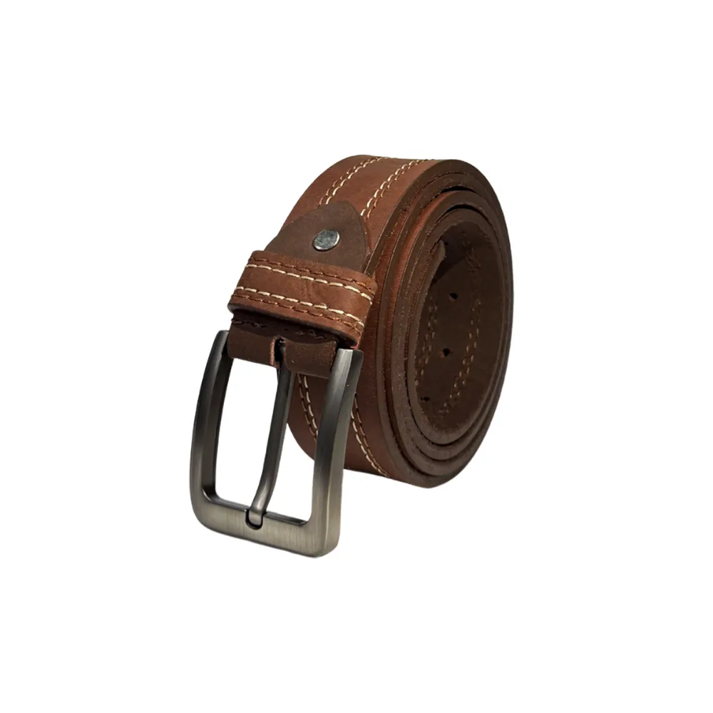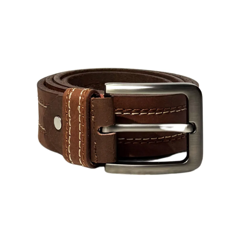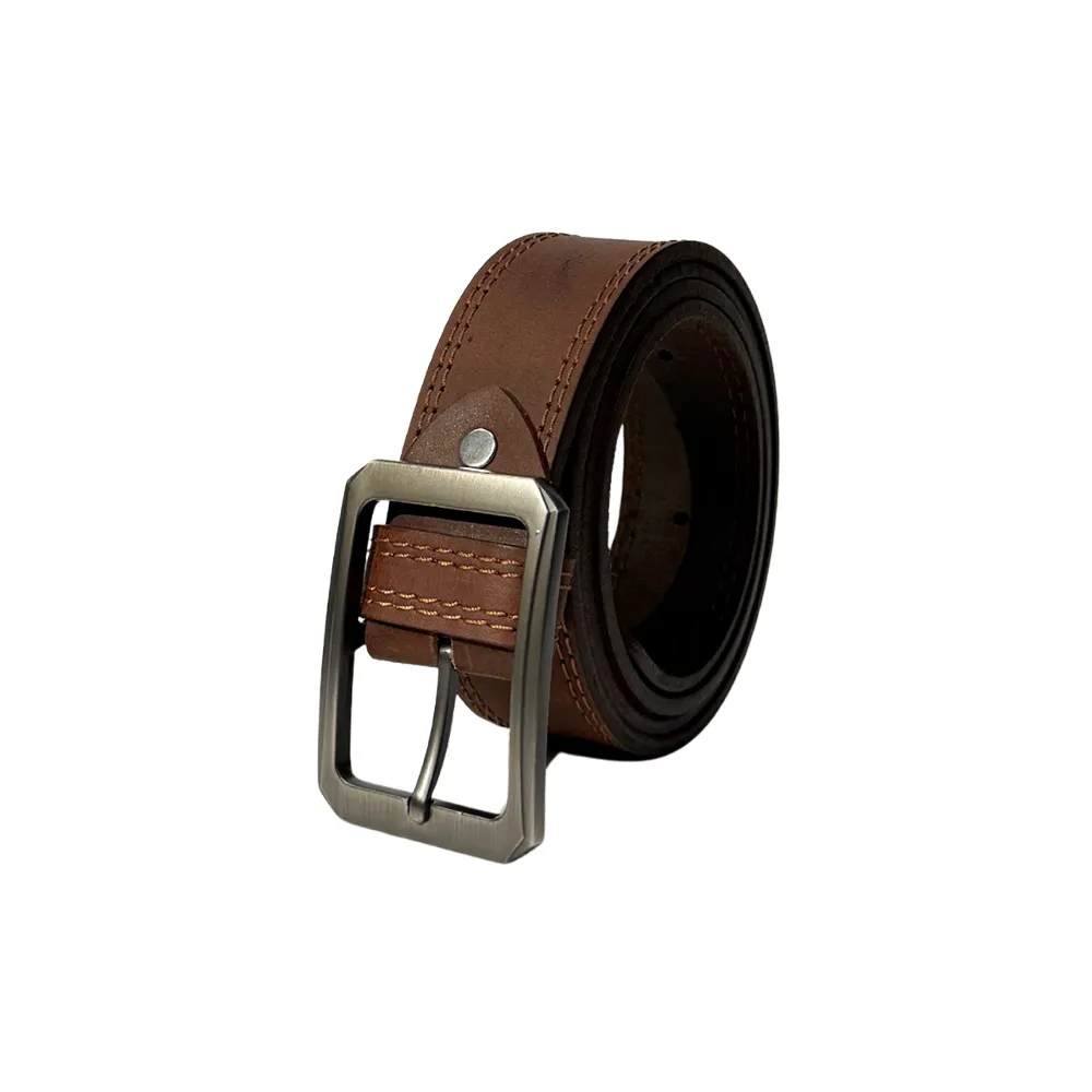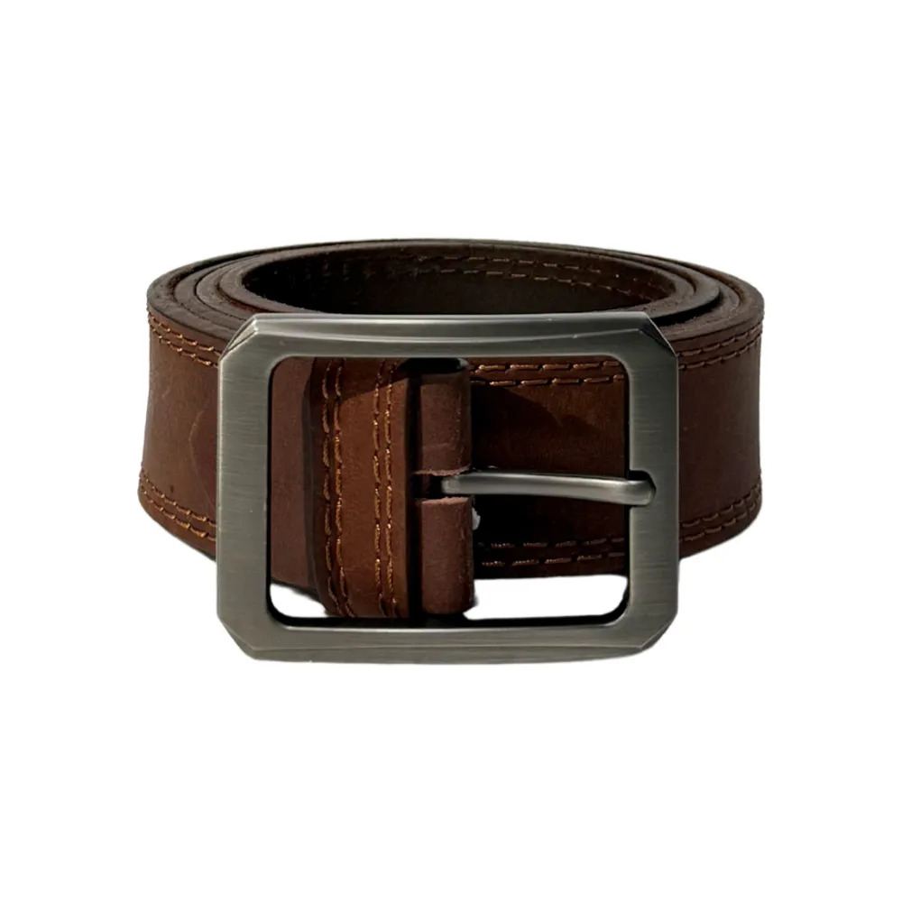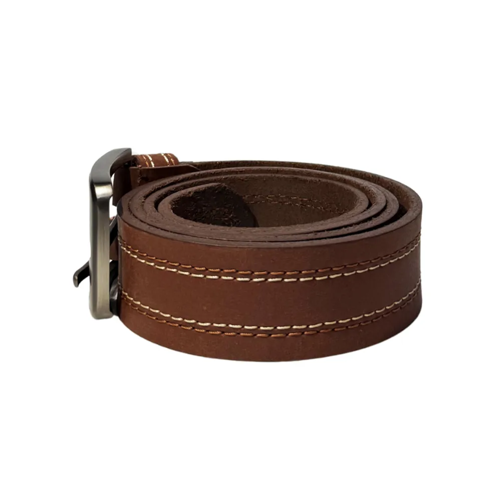 Single-piece leather belt with classic center stitching and vintage-inspired buckle.